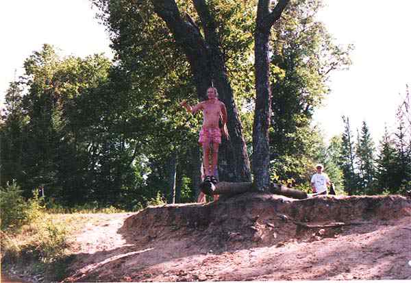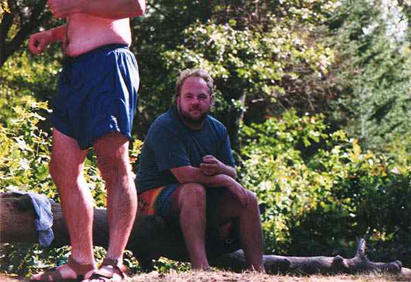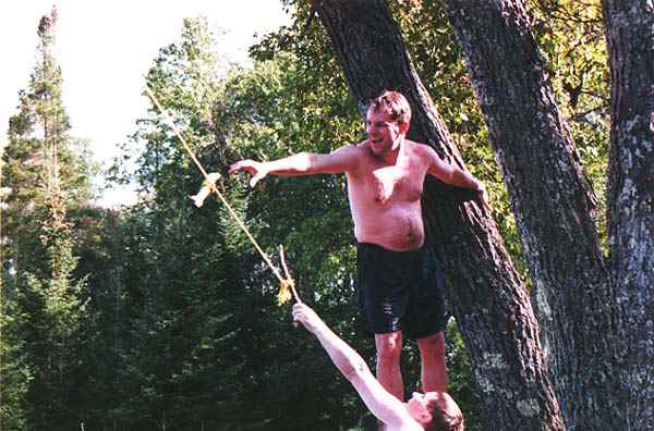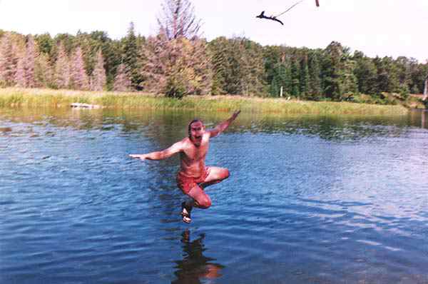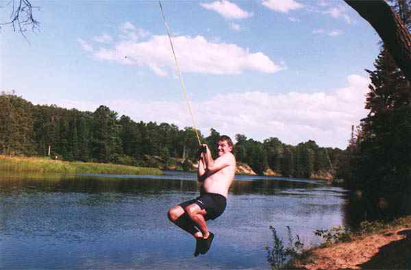 The highlight of every canoe trip. Rope swing day! Roger is carefully preparing for the first swing into the unknown. |